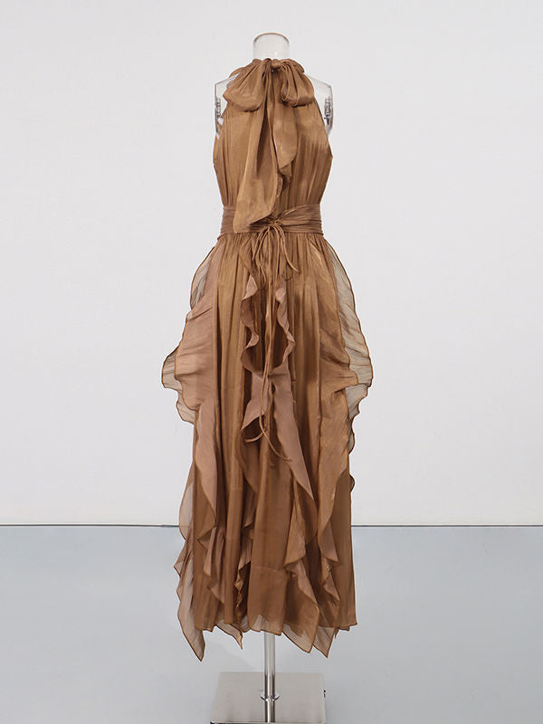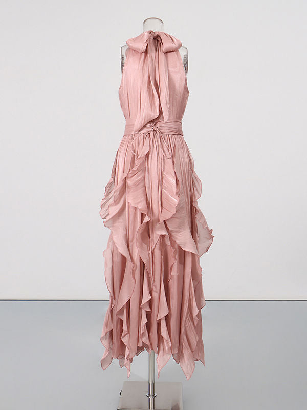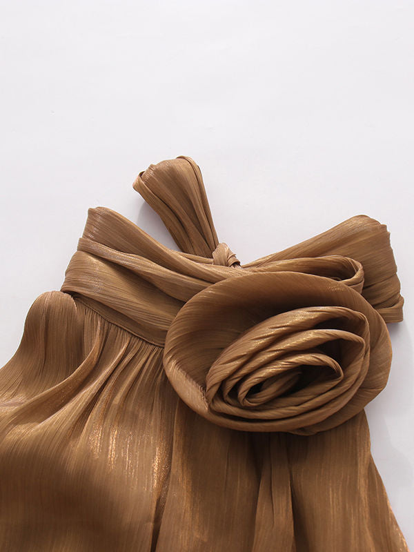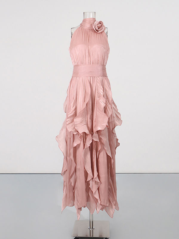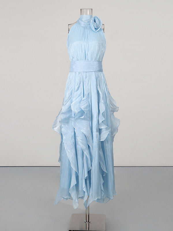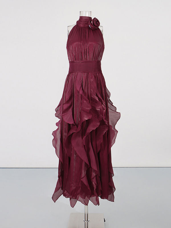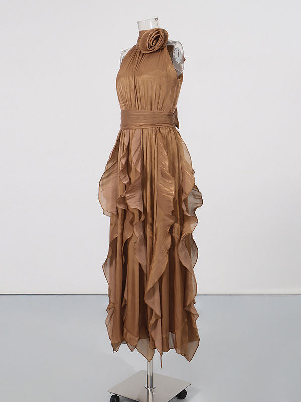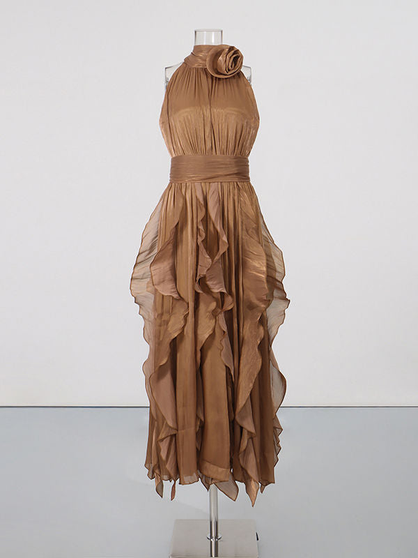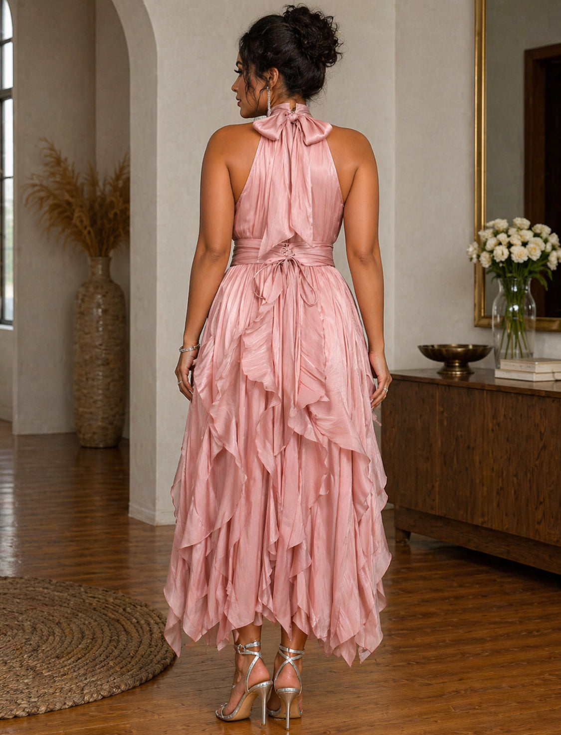 Elevate your occasion wardrobe with this effortlessly elegant halter midi dress, designed to capture attention with every step. Crafted in a soft, lightweight fabric, this piece features a high neckline adorned with a statement floral accent, adding a touch of romantic sophistication. The ruched bodice flows into a defined waistband that cinches the waist beautifully, creating a flattering, feminine silhouette.