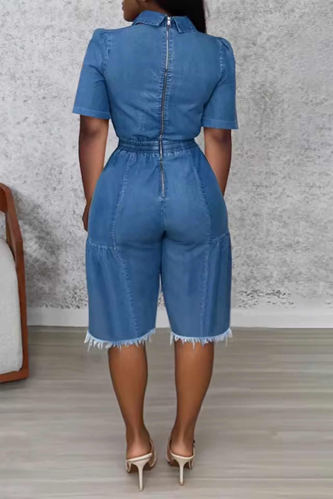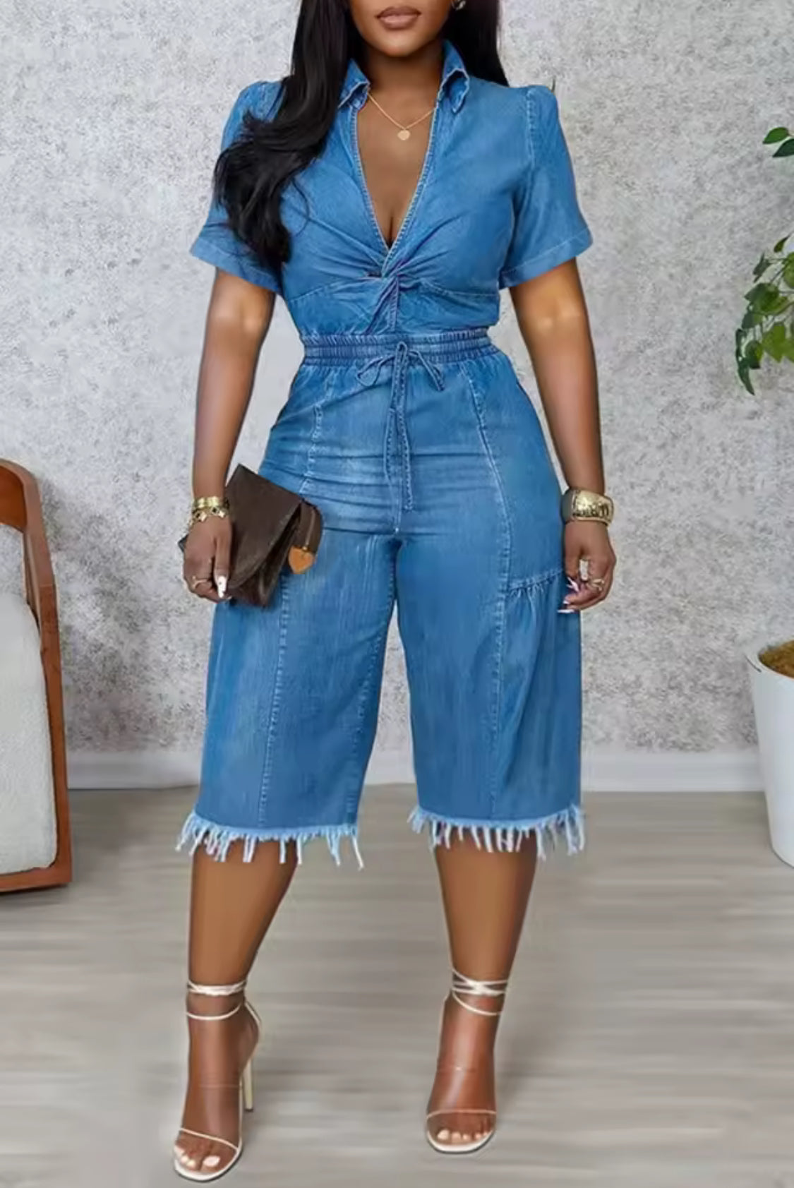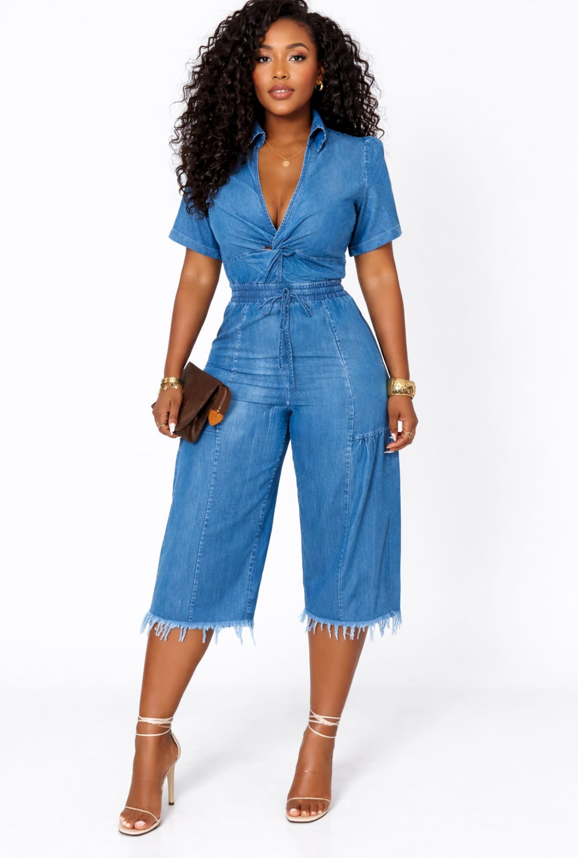 Effortlessly chic with a touch of edge, the Denim Darling Cinched Jumpsuit is your new go-to for laid-back glam. Designed in a soft, medium-wash denim, this jumpsuit features a flattering deep V neckline with a twist-front detail that accentuates the bust while the elastic cinched waist defines your curves in all the right places. The wide-leg, cropped silhouette is finished with a raw frayed hem for a trendy, casual vibe that transitions seamlessly from day to night.
