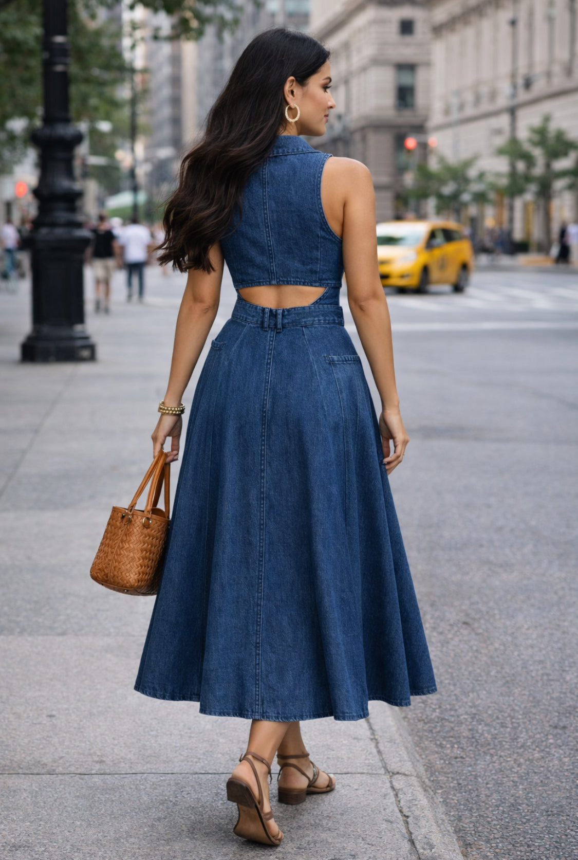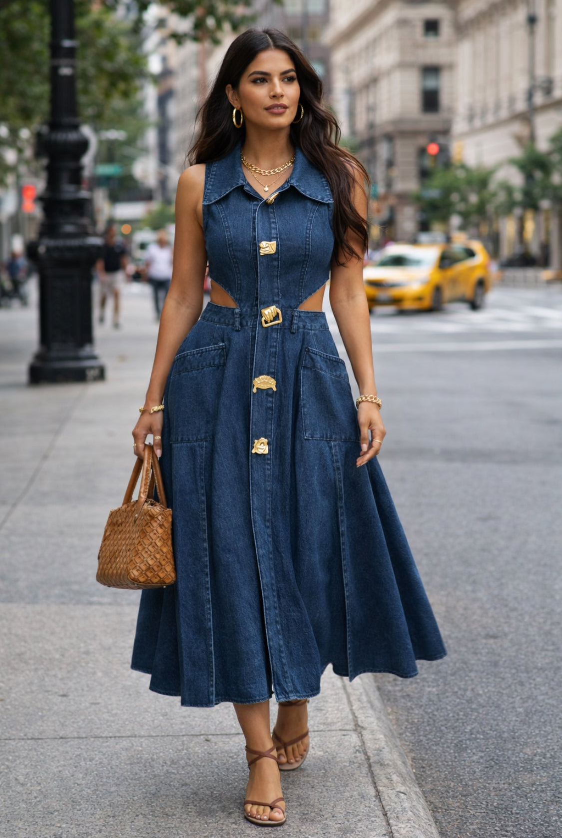 Turn everyday denim into a statement with this effortlessly chic midi dress. Designed with a structured sleeveless bodice and a modern waist cutout, this piece creates a flattering, cinched silhouette while adding just the right touch of edge. The full A-line skirt flows beautifully with every step, giving you movement, comfort, and timeless style all in one.