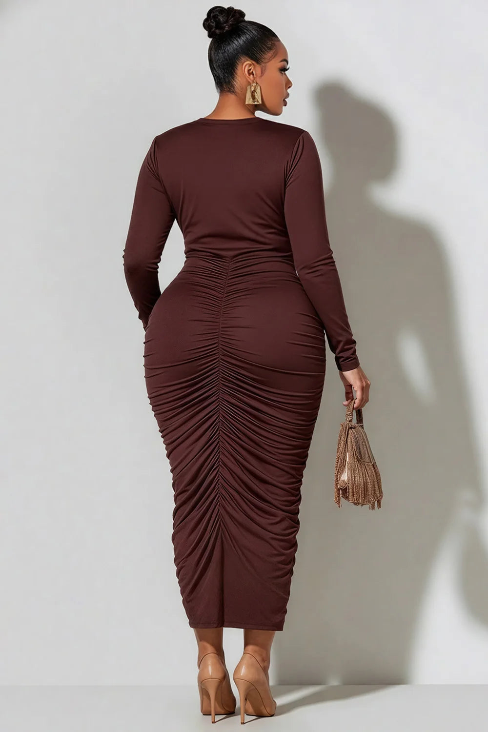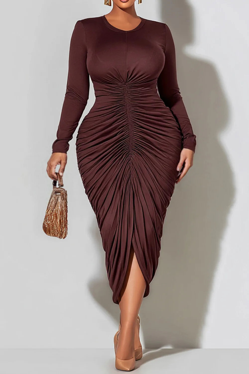 Turn heads and command the room in the Midnight Muse Ruched Midi Dress. Designed to flatter every curve, this stunning midi dress features a beautifully gathered ruched center seam that enhances your silhouette while creating a slimming, elongated look. The soft, stretch fabric hugs the body comfortably, while the long sleeves and classic round neckline add a touch of sophistication and balance.