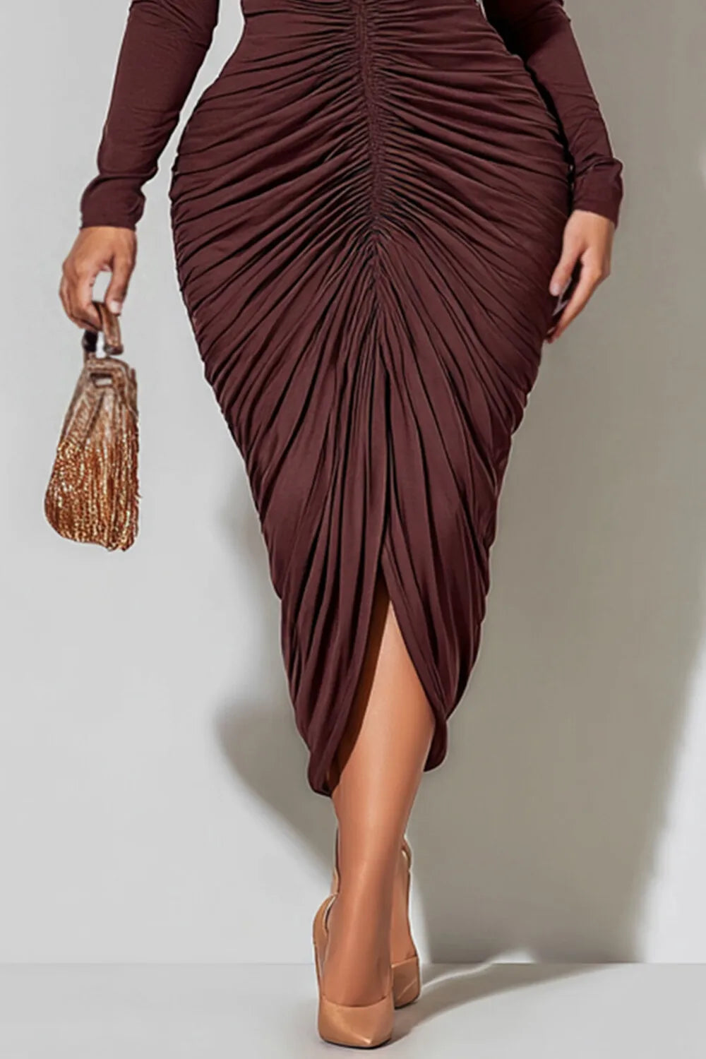 Brown Ruffled Bodycon Knitted Midi Dresses